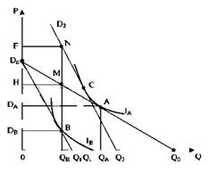 Сокращение потребления товара при цене Рд с величины QA до Qf вследствие уменьшения доходов потребителя по сравнению с доналоговьгм периодом — это эффект дохода. Уменьшение потребления товара с величины QF до величины QB при переходе от цены Рд к цене Рв — это результат эффекта замещения, то есть того, что покупатель замещает потребление товара, ставшего вследствие налогообложения более дорогим потреблением относительно более дешевых товаров