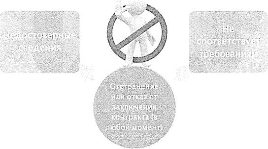 2. Отстранение участника закупки от участия 8 определении поставщика (подрядчика, исполнителя) или отказ от заключения контракта с победителем определения поставщика (подрядчика, исполнителя) осуществляется в любой момент до заключения контракта, если заказчик или комиссия по осуществлению закупок обнаружит, что участник закупки не соответствует требованиям, указанным в части 1, частях 1.1, 2 и 2.1 (при наличии таких требований) настоящей статьи, или предоставил недостоверную информацию в отношении своего соответствия указанным требованиям (рис. 21)
