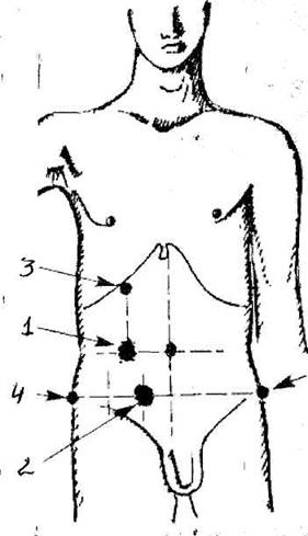 Рис 2. Перкуссия мочевого пузыря: 1-увеличенная предстательная железа;