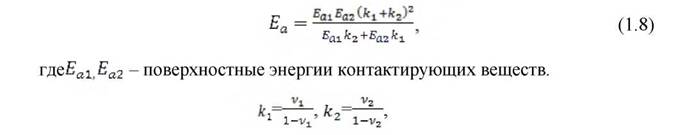 Следует отметить, что этот подход получил своё логическое развитие в ряде работ, связанных с установлением расчётно-аналитических зависимостей оценки энергии адгезии контактируемых между собой однокомпонентных и многокомпонентных конструкционных материалов и сред в различных сочетаниях и условиях их эксплуатации. Так, в работе [60] для оценки энергии адгезии двух различных разнородных сред, используя свободную поверхностную энергию каждой среды, предложена формула, допускающая, что поверхностная энергия и энергия адгезии равны энергии упругих деформаций, возникающих при образовании свободной поверхности и вступлении тел в адгезионный контакт: