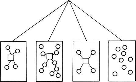 образуют то, что мы будем называть базисной моделью. Все, о чем базисная модель может поведать нам,— это то, что существует четыре различных класса. Три из них обладают внутренней структурой с центральной группой элементов. Центры отмечены на диаграмме квадратиками. Четвертый класс, составленный всеми теми элементами, которые не вошли в три предыдущих класса, не имеет внутренней структуры. Центры областей, представленных базисной моделью, также структурированы с помощью того, что мы назовем моделью основной оппозиции: