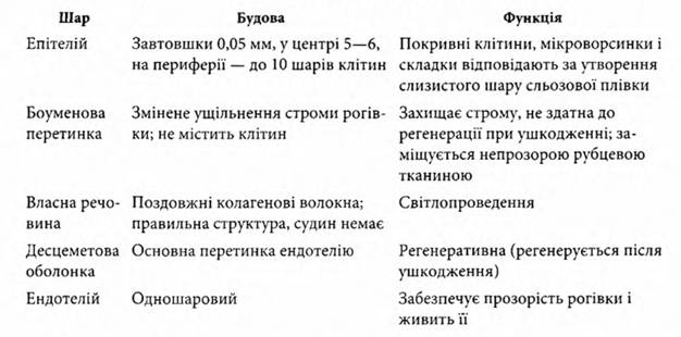 Гістологічно в рогівці виділяють п’ять шарів (табл. 7.1). Поверхневий шар представлений переднім багатошаровим епітелієм і виконуєтакі функції: оптичну («виправляє» всі дефекти поверхні), осмотичну (регулює надходження рідини у власну речовину — строму), тектонічну (заповнює глибокі дефекти тканини) і дихальну («утримує» кисень, що міститься у сльозовій рідині). За епітелієм розміщена безструктурна передня межова пластинка (lamina limitans anterior s. Bowmani). Під нею лежить власна речовина рогівки (substantia propria), що складається з паралельно розміщених пластинок і рогівкових клітин, локалізованих у проміжках між пластинками. До складу пластинок входять дуже тонкі колагенові фібрили, з’єднані між собою проміжною речовиною. Задня межова
