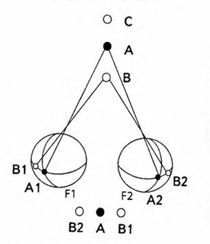 Поняття «бінокулярний зір» означає зір обома очима одночасно. Припустімо, що людина дивиться на точку A (мал. 15.2). Зображення її проектується на центральні ямки жовтої плями (фовеоли) Fl і F2; зоровими шляхами зображення від лівого ока передаються у мозковий центр, де відбувається злиття (фузія) образів в один. Це можливе лише за умови, що зображення однакові й потрапили на однакові ділянки сітківок (кореспондентні точки).