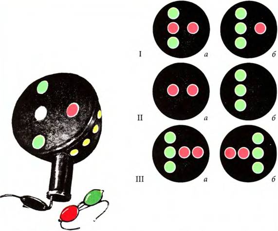 Мал. 15.3. Визначення характеру зору за допомогою кольоротесту: I — бінокулярний зір: а — провідне праве око; 6 — провідне ліве око; II — монокулярний зір: а — правобічний; 6 — лівобічний; III — одночасний зір: а — одноіменне двоїння; 6 — перехресне двоїння