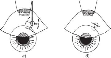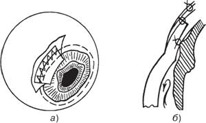 Рис. 50. Схема основных этапов склероувеорафии: а — откинут эписклеральный лоскут, и на рану в глубоких слоях склеры наложен непрерывный шов, захватывающий также наружную поверхность прилежащего цилиарного тела; б — уложены на место и подшиты эписклеральный и конъюнктивальный лоскуты.