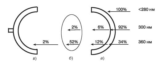 Ориентируясь на данную схему, следует иметь в виду, что роговица по- разному поглощает излучение и в пределах УФ-диапазона. Чем больше длина волны, тем большая часть излучения проникает и в более глубоколежащие образования, в частности во влагу передней камеры и стекловидное тело, а самая длинная часть может достигать и сетчатки, в особенности при афакии.