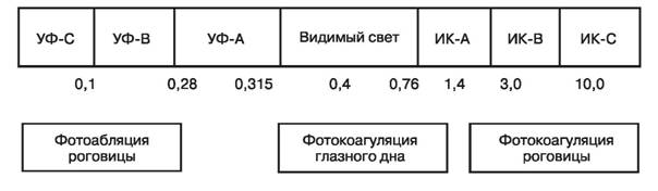 Такая же закономерность характерна и для излучения ИК-диапазона. Так, излучение полупроводникового лазера длиной волны 0,81 мкм на 97% проходит через оптические среды и достигает глазного дна, т. е. в таком же проценте, как и видимое красное, и лишь 3% его поглощают оптические среды. Но при увеличении длины волны до 1 мкм (неодимовый лазер) оптические среды поглощают уже 67% излучения и лишь 33% достигает глазного дна. Отсюда следует, что при использовании данного лазера для коагуляции образований на глазном дне большими дозами излучения неизбежно тепловое повреждение ткани роговицы и хрусталика.