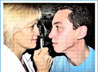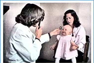 Зворотна офтальмоскопія. Дослідження проводять у темному приміщенні. Джерело світла (ліпше матова лампа 60—100 Вт) розташовують трохи ліворуч за головою пацієнта. Офтальмоскопом спрямовують світло від лампи на зіницю ока обстежуваного й, отримавши червоне світіння з очного дна, перед оком пацієнта розташовують лупу силою +10 ... +13 дптр за 10 чи 7—8 см від нього. Перед оком лікаря створюється уявне обернене збільшене в 4—6 разів зображення внутрішніх структур ока, яке він бачить через отвір офтальмоскопа (мал. 1.9).