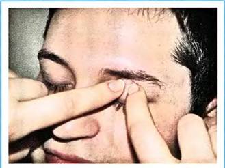 б) транспальпебральна пальпація — через повіки (хворого просять заплющити очі і дивитися вниз). Подушечки кінцевих фаланг вказівних пальців обох рук кладуть на м’яку частину верхньої повіки і по черзі натискають, оцінюючи ступінь щільності ока. Результати реєструють таким чином: Tn — нормальний стан BOT; Т+1 — помірне ущільнення ока порівняно з нормою; Т+2 — значне збільшення щільності ока; спостерігається легке втиснення склери; Т+3 — збільшення щільності настільки сильне, що навіть при інтенсивному натисканні неможливо втиснути склеру. Сумнівне підвищення BOT позначають T+. Цифри з протилежним знаком (T-1; T-2; T-3) означають три ступені зниження BOT. Цей метод неточний, орієнтовний, але не втратив своєї актуальності для швидкого визначення BOT (мал. 1.11).