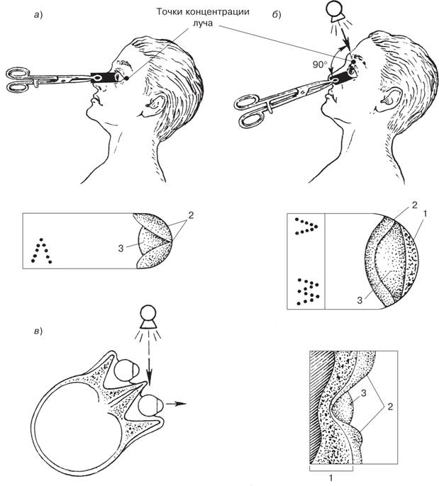 Рис. 78. Техника выполнения бессклелетных снимков: а — боковая проекция; б — аксиальная проекция; в — косая проекция касательным лучом по Поляку и схемы одноименных снимков: (7) — рентгеновское изображение костной стенки орбиты; (2) — век; (3) — глазного яблока. Пояснения в тексте.