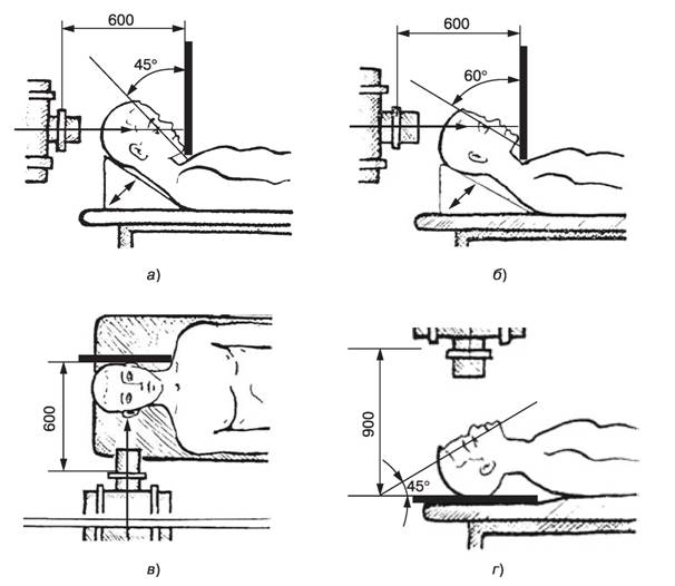 Рис. 79. Положение раненого и ориентация рентгеновской трубки при обследовании тяжело пострадавших (схема): а — в передней прямой проекции (направление взгляда перпендикулярно кассете)) б — в аксиальной проекции (направление взгляда параллельно кассете)) в — в боковой проекции (направление взгляда прямо перпендикулярно центральному лучу); г — в задней прямой проекции по Ициксон (направление взгляда прямо перпендикулярно кассете).