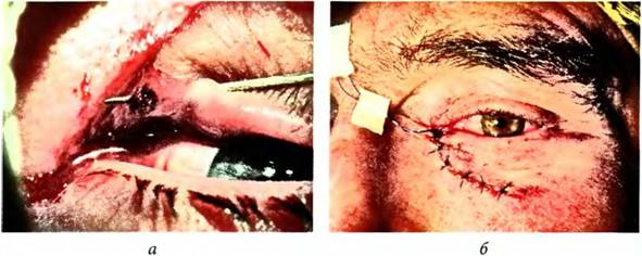Мал. 17.17. Відрив нижньої повіки з порушенням цілості нижнього нососльозового канальця: а — до ПХО; б — після ПХО