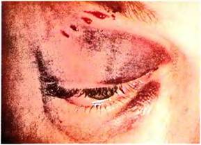 Мал. 17.19. Колота рана верхньої повіки (екзофтальм, ретробульбарна гематома)