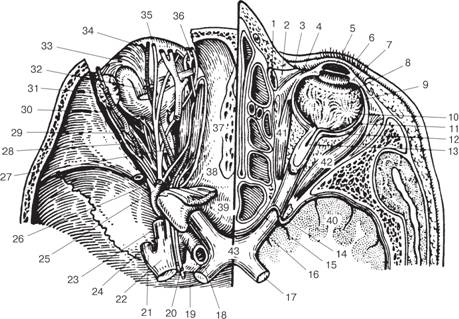 Рис. 3. Основание черепа со вскрытыми глазницами (по: Axenfeld Thv 1980): 1 — saccus lacrimalis; 2 — слезная часть круговой мышцы глаза (мышца Горнера); 3 — camncula lacrimalis; 4 — plica semilunaris; 5 — cornea; 6 — iris; 7 — corpus ciliare (хрусталик удален); 8 — ora serrata; 9 и 10 — choroidea (вид наружной поверхности); 11 — sclera; 12 — vagina bulbi (тенонова капсула); 13 — центральные сосуды сетчатки в стволе зрительного нерва; 14 — твердая оболочка орбитальной части зрительного нерва; 15 — sinus sphenoidalis; 16 — pars intracranialis n. opticus; 17 — tracus opticus; 18 — a. carotis interna; 19 — sinus cavernosus; 20 — a. ophthalmica; 21, 23, 24 — n. mandibularis, n. ophthalmicus и n. maxillaris; 22 — gangl. trigeminale; 25 — v. ophthalmica; 26 — fissura orbitalis superior (вскрыта); 27 — a. ciliaris posterior longae; 28 — nn. ciliares breves; 29 — a. lacrimalis; 30 — n. lacrimalis; 31 — gl. lacrimalis; 32 — m. rectus superior; 33 — сухожилие m. levator palpebrae superioris; 34 — a. supraorbitalis; 35 — n. supraorbitalis; 36 — n. supratrochlearis; 37 — n. infratrochlearis; 38 — n. trochlearis; 39 — m. levator palpebrae superioris; 40 — височная доля головного мозга; 41 — m. rectus medialis; 42 — m. rectus lateralis; 43 — chiasma opticum.