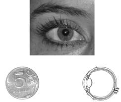 Рис. 15. Размеры глазного яблока. Длина переднезаднего отрезка нормального глазного яблока практически совпадает с диаметром монеты номиналом пять рублей