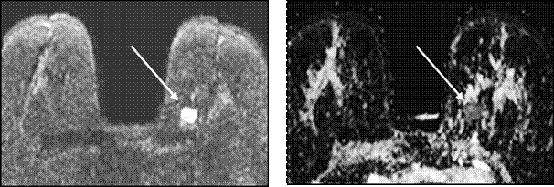 Рисунок 5 — МР-маммография. DWI. Стрелкой показано мягкотканое объемное образование в левой МЖ (А). На ADC карте стрелкой показано это же мягкотканое объемное образование, в котором определяется ограничение диффузии (Б).