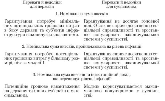 Іншими словами, апологети цього підходу розглядають загальнообов’язкову накопичувальну систему як таку, що функціонує за DB-схемою (схемою з встановленими виплатами). Із цим не можна погодитися хоча б тому, що такий підхід суперечить самій ідеології функціонування майбутньої вітчизняної обов’язкової накопичувальної складової пенсійної системи.Прибічники другого підходу висувають тезу щодо необхідності гарантування не збереження грошових коштів, а самого процесу їхнього накопичення за допомогою державних механізмів. Не заперечуючи жодним чином важливість вдосконалення державного регулювання та нагляду, зазначимо лише, що гарантування будь-якого процесу саме по собі мало що означає, коли, зрештою, має бути отриманий кінцевий результат. У нашому випадку нагляд за процесом накопичення необхідно вважати лише інструментом досягнення конкретної мети, але в жодному разі не метою - збереженням пенсійних накопичень громадян. При цьому не йдеться про конкретні суми коштів, які громадяни будуть отримувати після досягнення пенсійного віку. Тобто обов’язкова накопичувальна пенсійна система, як і передбачається, має реалізовувати DC-схему (схему із встановленими внесками). Проте збереження накопичень у повному обсязі (незалежно від конкретної суми) має бути гарантоване громадянину. Саме така позиція і є суттю третього підходу.