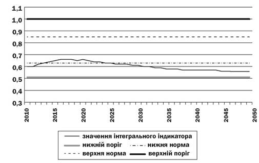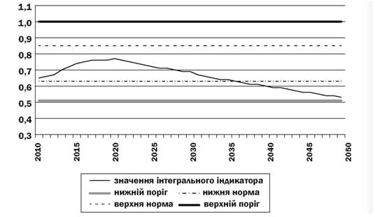 1. Загальна динаміка інтегрального індикатора пенсійної безпеки може бути охарактеризована таким чином. На періоді до 2023 р. спостерігається зростання показника, обумовлене позитивною зміною коефіцієнта системного навантаження внаслідок пенсійної реформи 2011 р. У 2024 р. дія ефекту підвищення пенсійного віку для жінок закінчується, отже, у подальшому спостерігаємо стійке зниження індикатора пенсійної безпеки: 2033 р. він виходить з оптимального коридору й наближається до нижнього порогового значення, а 2050 р. може перетнути його з такою тенденцією до подальшого зниження.