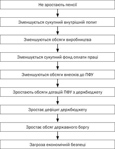 Але через особливості вітчизняного законодавства (ст. 22 Конституції України не дозволяє зменшувати або звужувати соціальні гарантії) кругообіг розривається. При незмінному рівні пенсій сукупний внутрішній попит із часом зменшується хоча б унаслідок інфляції, після чого вступають у дію певні економічні механізми (рис. 1.8). З урахуванням вищезазначеного докорінне реформування наявної пенсійної системи слід вважати одним із першочергових завдань укріплення економічної безпеки України. Різноманітні чинники (наприклад, динаміка тіньової економіки, емісія національної валюти для покриття дефіциту держбюджету тощо) можуть внести в ланцюг певні корективи, але вони у будь-якому випадку матимуть тимчасовий характер, не змінюючи взаємозв’язків і трендів загалом.