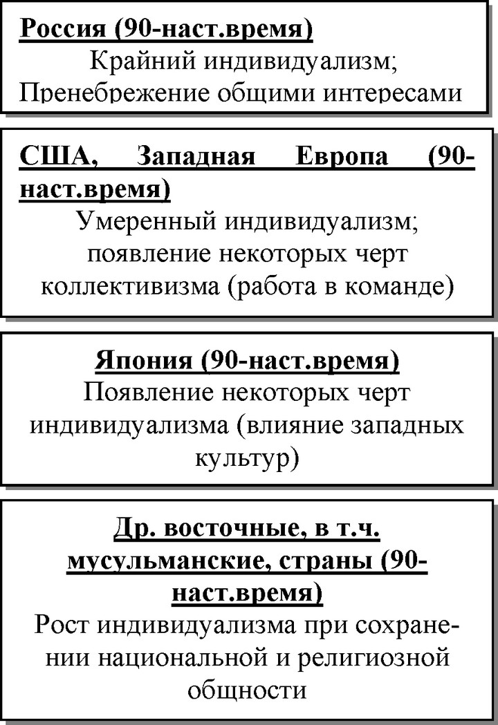 В западных культурах сегодня доминирует крайняя субъективизация сознания и абсолютизация свободы личности. В культурах Востока индивидуализм низкий, они находятся в состоянии «собственного средневековья», то есть коллективного самосознания с приоритетом религии, патриотизма, почитания старших, авторитаризма, иерархичности и т.д. Африканские культуры схожи с культурами Востока и тяготеют к групповым ценностям с сохранением жесткой иерархичности, культом мужественности и мощи, авторитарной властью в обществе, значимой роли религии, развитым коллективизмом. Для России характерно коллективное начало, идеи единства и общности всего человечества, особенности исторической миссии России. Однако в настоящее время возникают такие ценности, как индивидуальность, финансовое благополучие, преуспевание, образование, приоритет молодежи. Культуру России можно определить как среднюю между западной (культурой индивидуализма) и восточной (культурой коллективизма), то есть как «коллективный индивидуализм». География культуры выглядит как усиление индивидуализма по мере продвижения с Востока на Запад (рис.1.10).