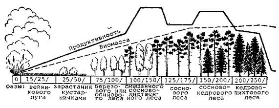 Схема хода сукцессии сибирской кедрово-пихтовой тайги со сменой пород после опустошительного лесного пожара