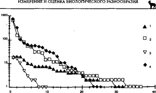 Ранговые распределения более непосредственно отражают видовую структуру и поэтому лучше интерпретируются в терминах обилий видов. Однако при общем подходе они менее удобны, так как их форма (и параметры) сильно зависит от соотношения немногих обильных видов, на которое оказывают влияние различные случайные факторы (Песенко, 1982).