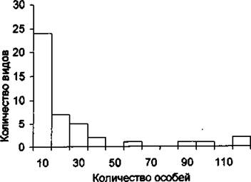 2. Частотное распределение — устанавливает зависимость между числом особей каждого вида и числом видов. Ось абсцисс — число особей. Ось ординат — число видов. Пример такого распределения представлен на рис.