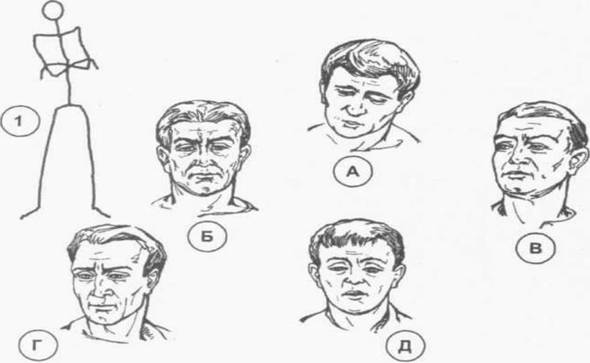 Завдання 1. Визначте за мімічними схемами, поданими на рисунку 1, емоційний стан людини (спокій, лють, задоволеність, радість, страх).
