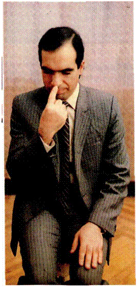 Больной в позе Ромберга с поворотом головы вправо. Левое ухо обращено вперед.