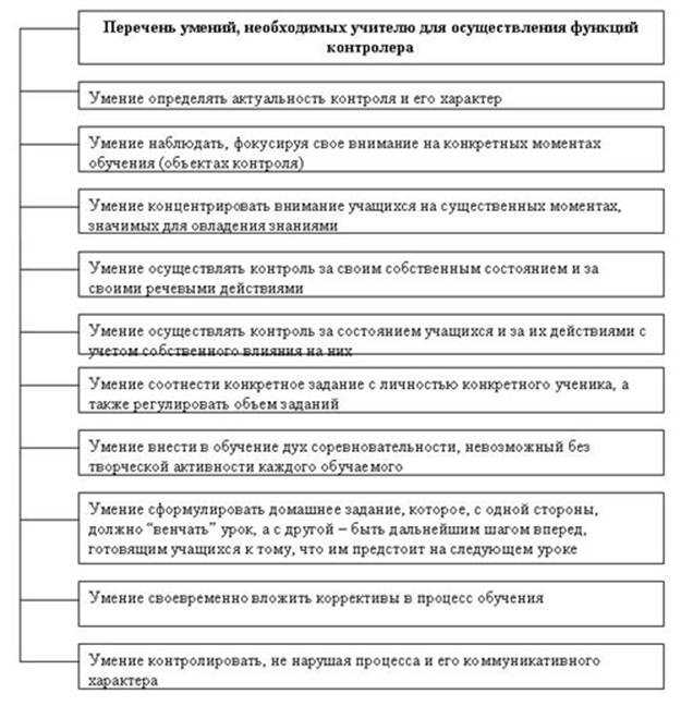 Два первых – это уровень стандарта. Успешное выполнение двух заданий свидетельствует о соответствии знаний ученика государственным требованием стандарта “удовлетворительно”. Их обязаны делать все учащиеся. Третье задание – это уровень “хорошо”, четвертое – “отлично”. Учитель проектирует содержание диагностики, исходя из содержания микроцели: очень важно дифференцировать трудность и сложность заданий по указанным трем уровнем.Контроль призван обеспечить управление процессом обучения, поскольку он есть средство усиления мотив мотиваций. Контроль формирует внимание учителя на конкретную ситуацию обучения. В каждой конкретной ситуации представлено и прошлое (предшествующееся обучение, личный опыт учителя, личный опыт учащихся, их взаимоотношения и т.п.) и будущее (конечные цели обучения, то общее что свяжет участников общения по истечении данной ситуации, их взаимоотношения и т.п.). и именно поэтому каждая конкретная ситуация есть ступень в продвижении к цели. Таким образом, достичь цели можно лишь в том случае, если учитель в состоянии контролировать себя и своих учеников.