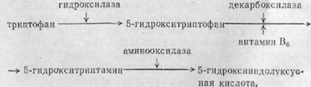 При нормальных условиях метаболизма эта реакция имеет весьма ограниченное значение. Однако можно предполагать, что когда обычные пути обмена фенилаланина блокированы, часть его трансформируется по добавочным путям, образуя о-тирозин и его дериваты. В последнее время при фенилкетонурии уделяется много внимания вторичным нарушениям метаболизма триптофана. Как уже указывалось, при этом заболевании легко возникают процессы дезаминирования. Если дезаминированию, подвергается триптофан, то последовательно образуются индолпировикоградная, индолуксусная и ин- долмолочная кислоты. Образование этих дериватов ведет к избыточному выделению их с мочой у больных фенилкетонурией. Интересно отметить, что эти индо- ловые соединения исчезают при назначении больным диеты, бедной фенилаланином. Дальнейшие исследования выяснили, что, кроме того, имеется нарушение перехода триптофана в серотонин. В норме этот переход осуществляется следующим образом:
