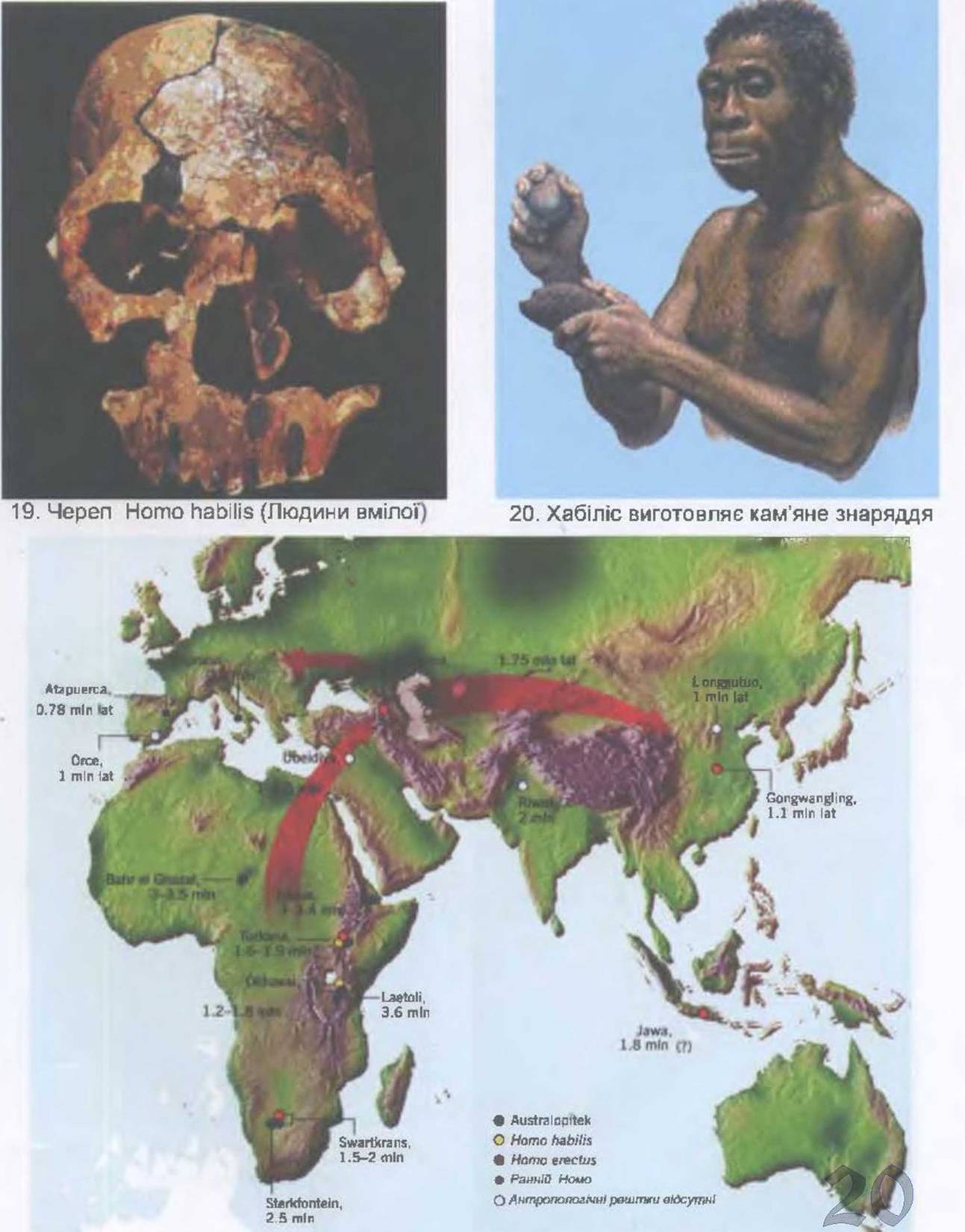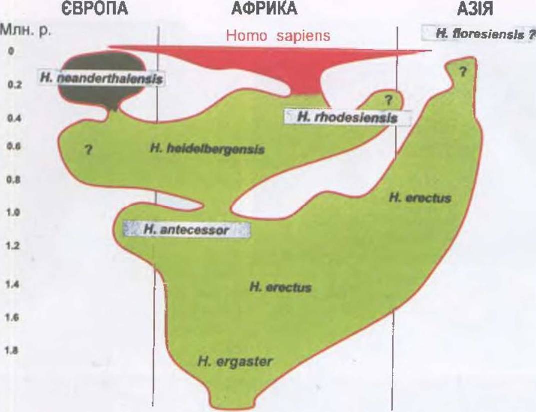 25. Схема розселення ранніх Ното і Homo sapiens на різних континентах впродовж 2 млн р.