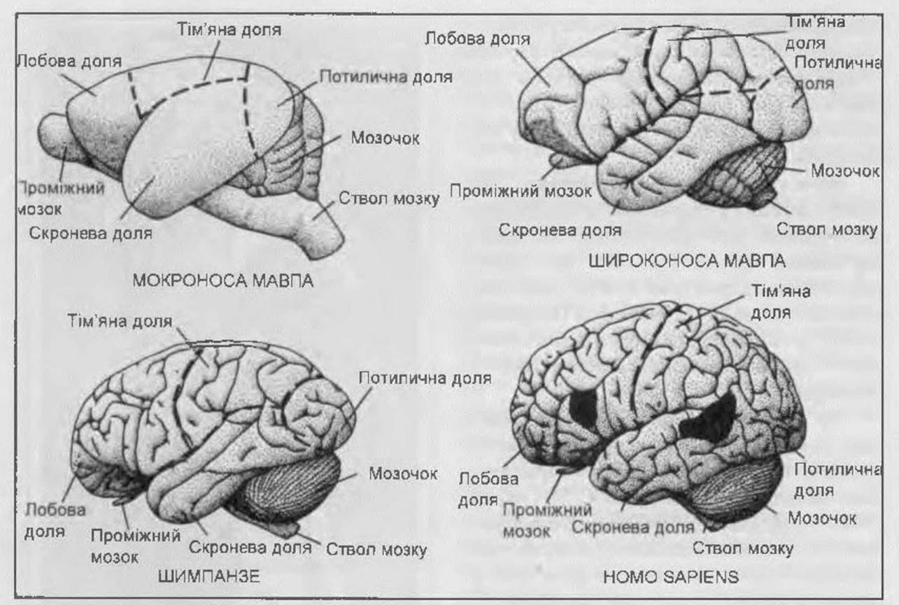 Рис. 14. Порівняльна характеристика мозку різних приматів і людини