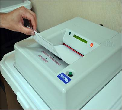 - в сканирующее устройство избирательные бюллетени вводятся только при горящем зеленом индикаторе;