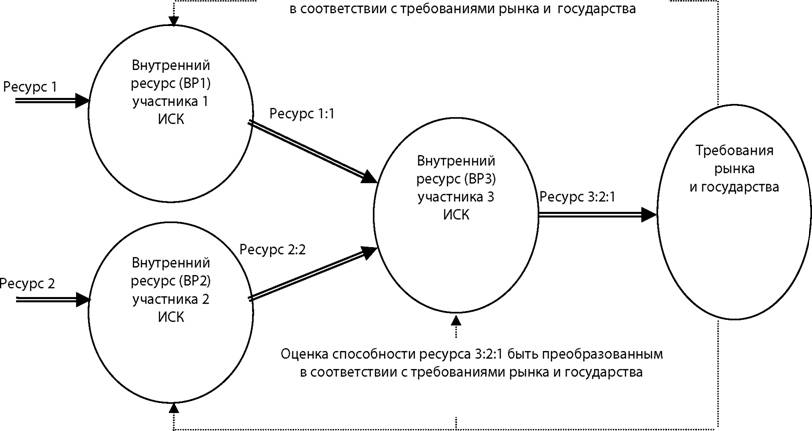ВР1 — внутренний ресурс участника 1 ИСК (технологии, комплектующие, идеи, персонал и т. д.); ресурс 1:1 — промежуточный строительный продукт, выпущенный участником 1 ИСК, необходимый участнику 3 ИСК для реализации следующей стадии процесса производства конечного строительного продукта (технологической цепочки); ресурс 3:2:1 — конечный строительный продукт, проверенный на соответствие требованиям рынка и государства, обладающий способностью удовлетворять потребности заказчика