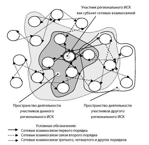 В рыночном пространстве деятельности участников регионального ИСК можно выделить сетевые взаимосвязи первого, второго и др. порядков. К взаимосвязям первого порядка относятся связи данного участника регионального ИСК с непосредственными участниками процесса производства конкретного строительного продукта. К взаимосвязям второго порядка относятся связи участников данного регионального ИСК с участниками других региональных ИСК, производящих другой строительный продукт. Аналогично выделяют взаимосвязи третьего, четвертого и т д. порядков. В большинстве случаев для эффективного управления процессом создания конечного строительного продукта участниками данного регионального ИСК достаточно учесть влияние взаимосвязей второго порядка. в то же время в предпринимательской среде существуют взаимосвязи, имеющие значение для всех участников ИСК независимо от того, к какому региональному ИСК они относятся (например, взаимосвязи по вопросам разработки технических регламентов и др.).