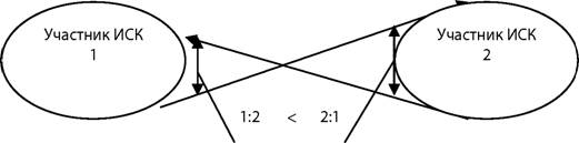 1:2 — расстояние между управленческим воздействием первого участника регионального ИСК и реакцией второго на это воздействие; 2:1 — аналогичное расстояние для второго участника регионального ИСК