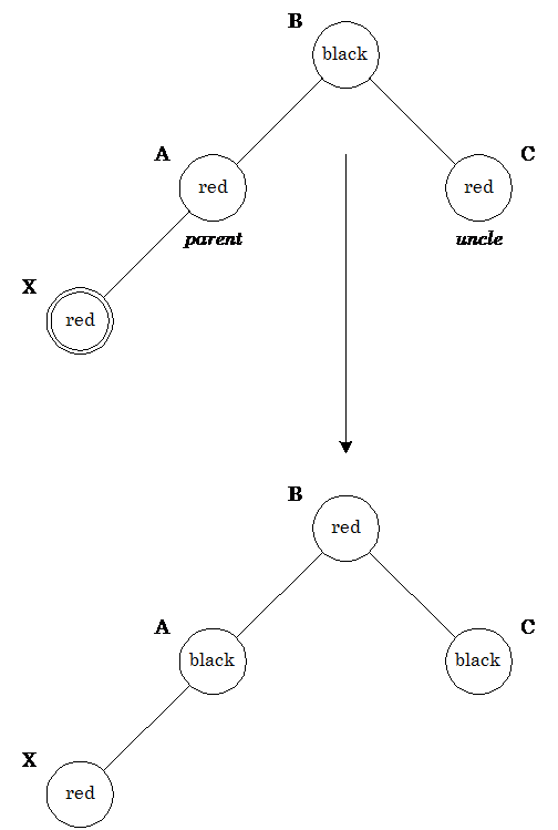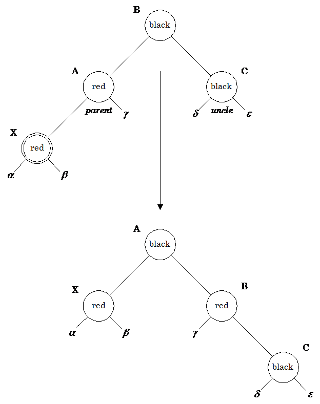 Здесь узлы может понадобиться вращать, чтобы скорректировать поддеревья. В этом месте алгоритм может остановиться из-за отсутствия красно-красных конфликтов и вершина дерева (узел A) окрашивается в черный цвет. Обратите внимание, что если узел X был в начале правым потомком, то первым применяется левое вращение, которое делает этот узел левым потомком.Каждая корректировка, производимая при вставке узла, заставляет нас подняться в дереве на один шаг. В этом случае до остановки алгоритма будет сделано 1 вращение (2, если узел был правым потомком). Метод удаления аналогичен.