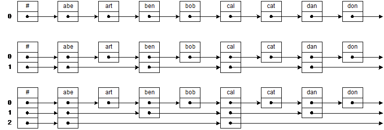 Идея, лежащая в основе разделенных списков, очень напоминает метод, используемый при поиске имен в адресной книжке. Чтобы найти имя, вы помечаете буквой страницу, откуда начинаются имена, начинающиеся с этой буквы. На рис. 3.8, например, самый верхний список представляет обычный односвязный список. Добавив один “уровень” ссылок, мы ускорим поиск. Сначала мы пойдем по ссылкам уровня 1, затем, когда дойдем по нужного отрезка списка, пойдем по ссылкам нулевого уровня.