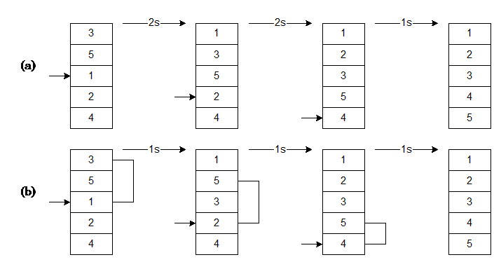 На рис. 2.2(a) был приведен пример сортировки вставками. Мы сначала вынимали 1, затем сдвигали 3 и 5 на одну позицию вниз, после чего вставляли 1. Таким образом, нам требовались два сдвига. В следующий раз нам требовалось два сдвига, чтобы вставить на нужное место 2. На весь процесс нам требовалось 2+2+1=5 сдвигов.