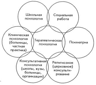 ют выделение в психологии отдельной области, посвященной психотерапии и консультированию. На рис. 3 отражены взаимоотношения между терапевтической психологией как теоретической дисциплиной и смежными с ней областями психологической помощи. Кроме того, Л. Брэмер и Э. Шостром считают, что консультирование и психотерапия также представляют собой два полюса континуума, но не между медициной и психологией, а внутри терапевтической психологии. Поэтому иногда в тексте используется термин «психотерапия», например, когда существует устоявшееся выражение (РЭТ — рационально-эмоциональная терапия, гештальт-тератшя), или когда понятия консультирование и психотерапия можно использовать в качестве синонимов (рис. 3).
