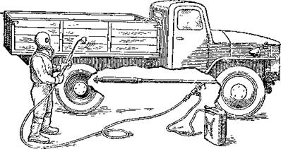 дезинфекции артиллерийских орудий и минометов; ранцевый дегазационный прибор (РДП-4В) для дегазации и дезинфекции орудий, минометов, танков, бронетранспортеров, автомобилей; индивидуальный комплект для специальной обработки автотракторной техники (ИДК-1); автомобильный комплект для специальной обработки военной техники (ДК-4) (рис. 31); авиационный
