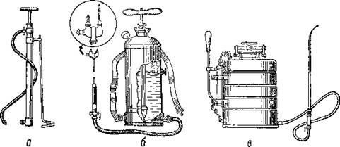 Рис. 33. Приборы-распылители дезинфекционных средств: а — гидропульт; б — автомакс; в — ранцевый дегазационный прибор