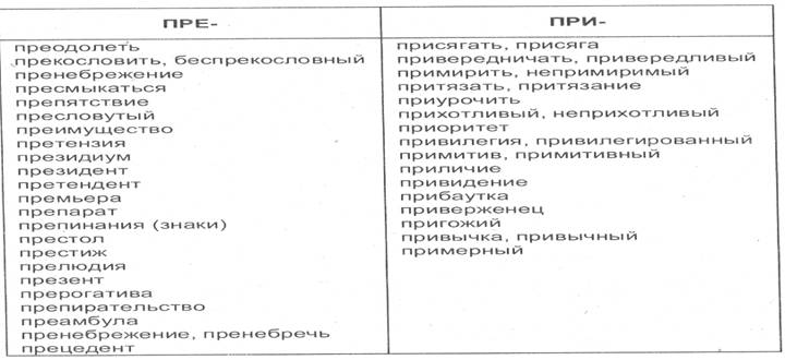 • приставок ПРИ и ПРЕ (ПРИ= «приближение», «присоединение», «около», «чуть-чуть, слегка»; ПРЕ= «очень», «пере»; вспоминаю словарные слова с ПРИ и ПРЕ: