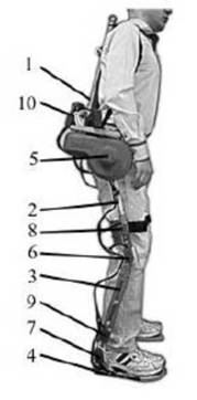 Комплекс состоит из жесткой рамы 1, соединенной с туловищем, звена 2, параллельном бедру; звена с регулируемой длиной, параллельном голени; звена 4, параллельном стопе; тазобедренного шарнира 5; коленного шарнира 6; голеностопного шарнира 7; акселерометров 8,9, закрепленных на звеньях; блока электроники 10.