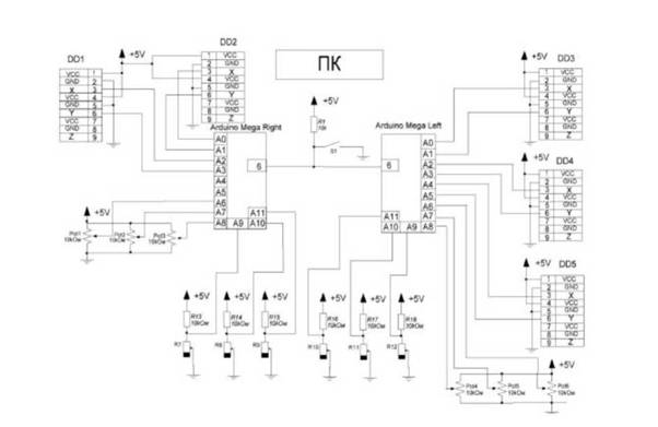 Рисунок 2.14 - Принципиальная электрическая схема измерительной системы: Arduino Mega Right, Arduino Mega Left - контроллеры, снимающие данные с правой и левой частей экзомежурера; R7, R8, R9, R10, R11, R12 - резистивные датчики давления; R1; R13, R14, R15, R16, R17, R18, - резисторы; DD1, DD2, DD3, DD4, DD5 - разъёмы для подключения акселерометров; Pot1, Pot2, Pot3, Pot4, Pot5, Pot6 - потенциометры