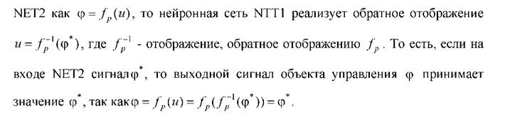 Если предварительно обученную ВР включить в последовательную схему нейросетевого управления, то она на выходе все равно будет отображать пару векторов φ и и несмотря на то, что на входе будет присутствовать только один вектор φ. Использование сети ВР в последовательной схеме нейросетевого управления по схеме специализированного обучения обуславливается её уникальной способностью порождать функцию и обратную к ней. Следовательно, после обучения сети имеется возможность предъявлять на её вход только вектор φ, заполняя вектор и нулевыми элементами, получая при этом на выходе вектор управляющих напряжений, на который настроена нейронная сеть. При этом размерности векторов φ и и могут не совпадать, что характерно для многосвязных систем управления.