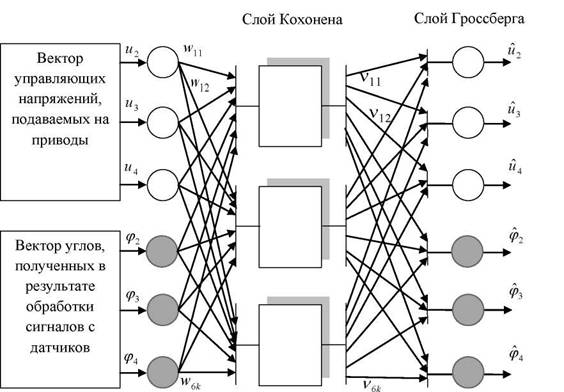 Для инверсии нейронной сети NET1 используем нейронную сеть встречного распространения (ВР), которая является универсальным инвертором [100].Сеть ВР состоит из двух слоёв: слоя Кохонена и слоя нейронов Гроссберга (рисунок 2.6). На вход сети поступает пара векторов φ и и . На выходе получаем их копии φ и U.