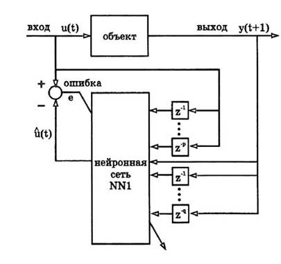 Для обеспечения заданных показателей качества управления нейронная сеть должна подавать на вход объекта управления еще и сигналы, определяемые задержками входа и выхода, то есть нейроконтроллер должен обладать памятью. Схема обучения эмулятора с памятью для схемы реализации инверсной динамики рисунок 2.4 представлена на рисунке 2.7.