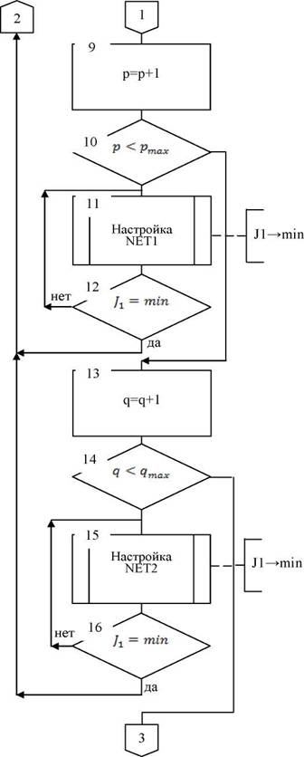 Блоки 9...12 осуществляют оптимальный выбор весов интегратора NET1. Рост pпрекращается после того как он достиг максимального заданного значения. После этого осуществляется переход на блоки 13.16, которрые повторяют аналогичную процедуру для дифференциатора.